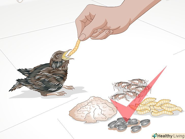 Для всеїдних птахів використовуйте собачий або котячий корм. [22] багато диких птахів є всеїдними, а своїх пташенят батьки вигодовують, в основному, комахами. Це означає, що дієта таких птахів багата тваринним білком, як і котячий або собачий корм. [23]- Якщо ви будете використовувати сухий корм, замочіть його у воді на годину. Однак з корму не повинна текти вода, так як вона може потрапити в легені і погубити пташеня. Корм повинен бути м'яким, але не мокрим. [24]