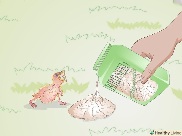 Годуйте зерноядних птахів спеціальною зерновою сумішшю для вигодовування пташенят. якщо виявлений вами пташеня відноситься до виключно зерноядним птахам, придбайте для нього в зоомагазині зернову суміш для вигодовування пташенят. Зазвичай в зоомагазинах можна знайти суміш для вигодовування пташенят великих папуг. [27]- Використовуйте шприц для подачі суміші пташеняті в глотку глибше голосової щілини. [28] голосова щілина розташовується близько трахеї. Ви зможете помітити невеликий отвір в глибині горла пташеня там, де розкривається трахея. Не можна, щоб корм або вода потрапили в цей отвір. Тому опустіть кінчик шприца глибше голосової щілини. [29]