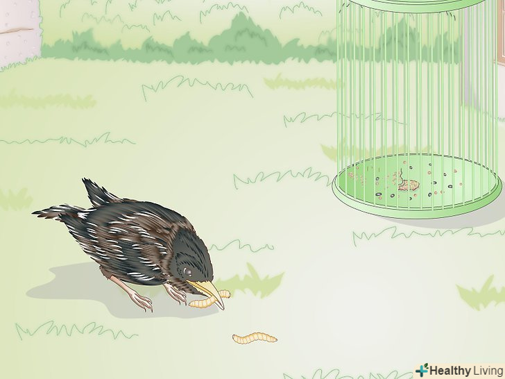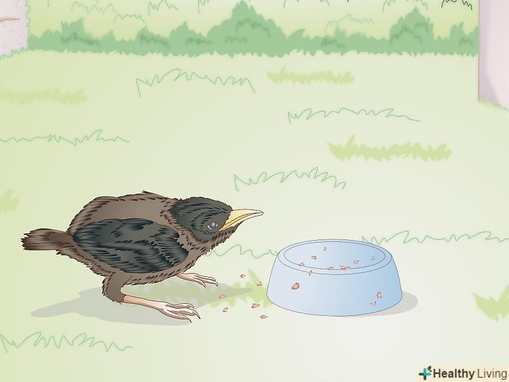 Коли пташеня досягне чотиритижневого віку, дозвольте йому почати харчуватися самостійно. приблизно в чотири тижні пташеня повинен почати вчитися самостійно харчуватися. Однак для цього може знадобитися ще приблизно місяць. Ви повинні продовжувати годувати пташеня вручну весь цей час, але також ставити для нього мисочку з кормом в клітку. На даному етапі вже можна поставити пташеняті і дуже неглибоке блюдце з водою. [37]- З часом ви помітите, що пташеня стане проявляти менший інтерес до ручним годуванням. [38]