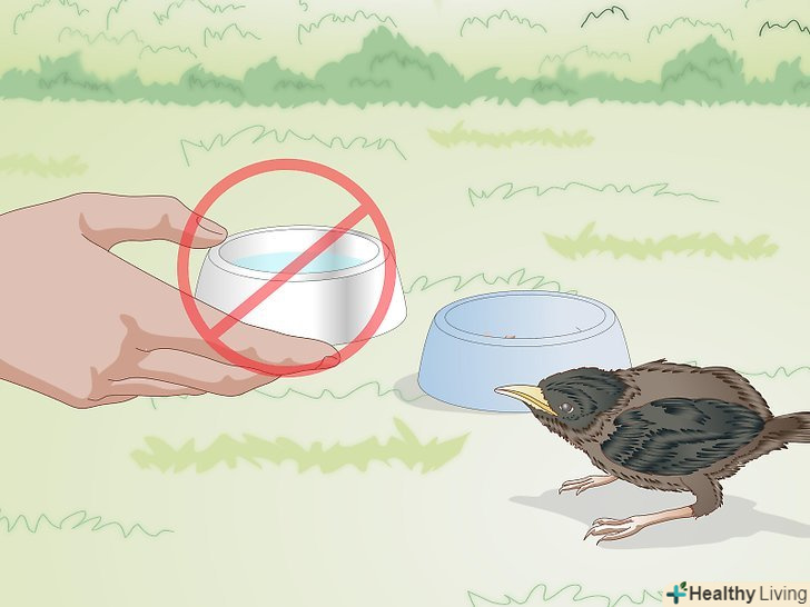 Не давайте пташеняті воду. якщо корм досить розмочений, то пташеняті не потрібна додаткова вода, по крайней мере, поки він ще не оперився. Якщо ви даєте пташеняті воду, це може принести більше шкоди, ніж користі, так як пташеня може вдихнути її і загинути. [31]- Якщо пташеня здається зневодненим, коли ви тільки принесли його додому, можна дати йому ізотонічний спортивний напій для заповнення водного балансу, наприклад, Gatorade або Powerade. Помістіть краплю напою в дзьоб пташеняті за допомогою пальця, щоб пташеня міг злизати її. До ознак зневоднення у пташеня відносять сухий рот і почервоніння шкіри. Також при зневодненні шкірка на задній частині шиї не приймає негайно колишню форму, якщо її защипнути. [32]