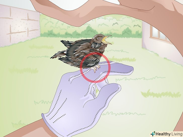 - Щоб зловити пташеня, піднесіть до нього одну руку зверху над головою і спиною, а іншу руку — знизу під живіт і лапки. Не переживайте про те, що мати відмовиться від пташеня через те, що ви брали його в руки. Вона з радістю прийме його назад в гніздо. [5]