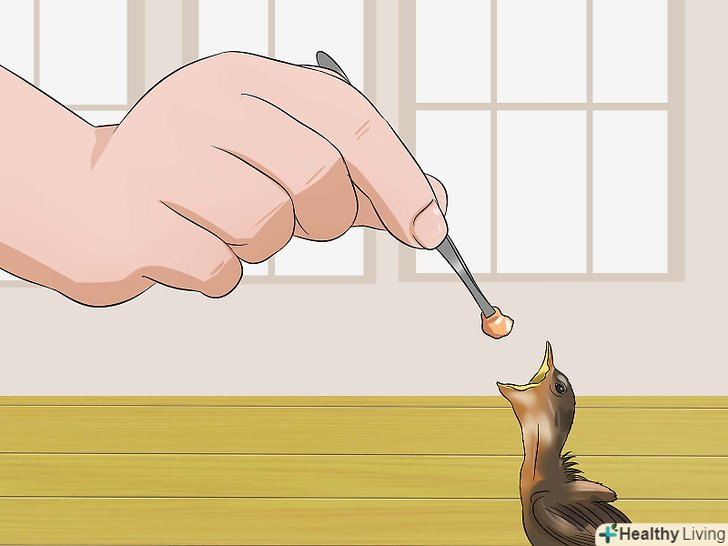 Нагодуйте пташеня. Дайте пташеняті корм маленьким предметом — щипцями для брів, зубочисткою, пластиковою ложечкою, дитячим шприцом. [34] [35] покладіть на імпровізовану ложку невелику кількість корму і направте її до правої (у вас це буде ліва) стороні горла. [36]- У лівій частині знаходиться трахея. [37] як і у людей, потрапляння їжі в трахею небезпечно.