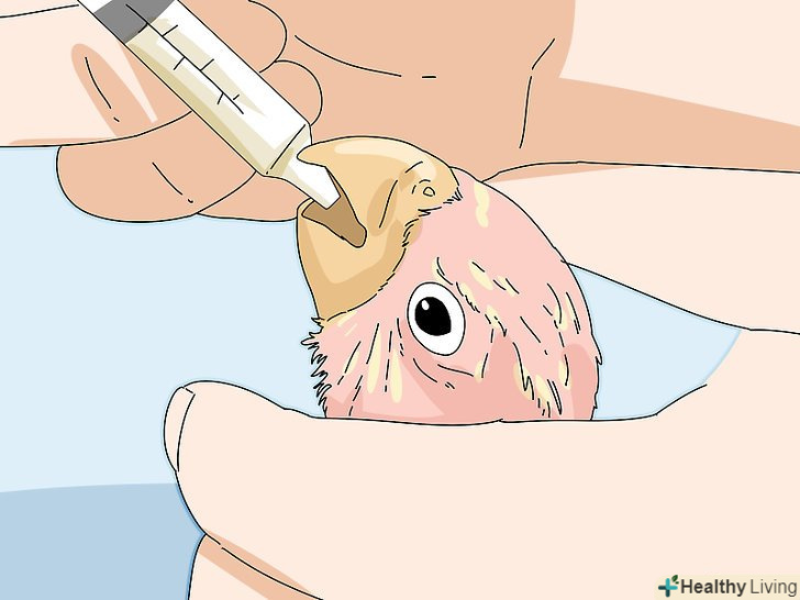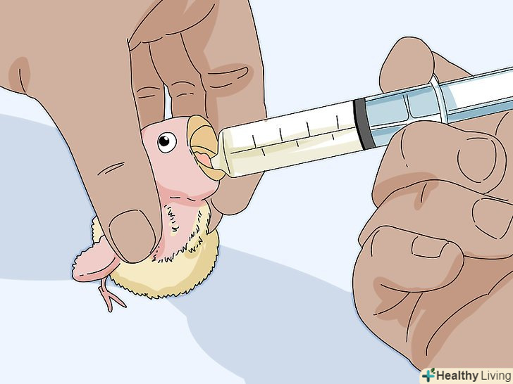 Годуйте нерозлучників не поспішаючи. Візьміть пташеня в одну руку і пальцями обережно вхопіться за його груди. Наповніть шприц сумішшю (6-8 мл). Капніть трохи суміші на руку, щоб переконатися, що вона не надто гаряча. Обережно закиньте голову папужки назад. Вставте шприц в дзьоб і почніть його годувати. [13]- Годуєте пташеня не поспішаючи, з такою швидкістю, з якою він встигає з'їдати суміш. Не намагайтеся змусити пташеня силком їсти зі шприца.