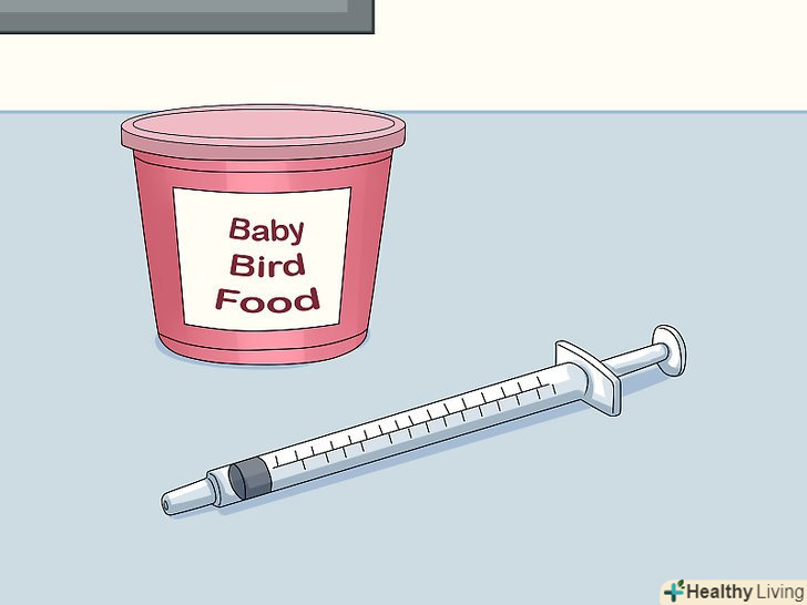 Візьміть шприц і корм для пташенят. знайдіть невеликий шприц з невеликим отвором для голки. Їх можна купити в зоомагазині або замовити онлайн. Вам також знадобиться корм для пташенят, який часто продається у вигляді порошків. [12]- Щоб приготувати суміш для годівлі, висипте порошок в окріп. Співвідношення води і порошку можна дізнатися, прочитавши інструкцію на упаковці корму.