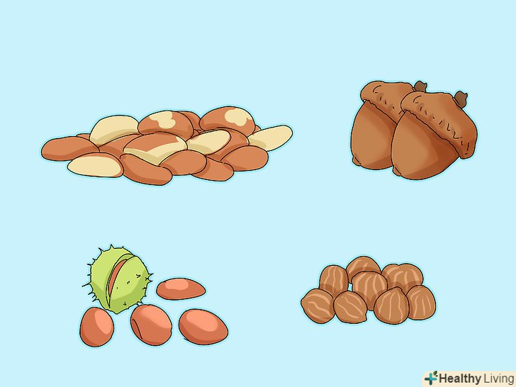 Запропонуйте нерозлучникам перекусити невеликими горішками. Нерозлучникам також подобається арахіс в шкаралупі і без, бразильський горіх, жолуді, кінський каштан і фундук. Горіхи можна давати у вигляді частування або як добавку до основної їжі. [5]
