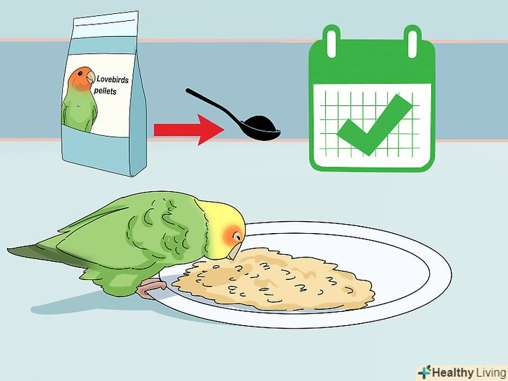 Давайте нерозлучникам 1 столову ложку (14 мг) гранульованого корму в день. відміряйте для одного папужки 1 столову ложку корму. Їх раціон на 70 % повинен складатися з гранульованого корму і на 30 % — з фруктів і овочів. [7]- Постарайтеся годувати нерозлучників в один і той же час. Так вони будуть знати, коли настає час годівлі.
