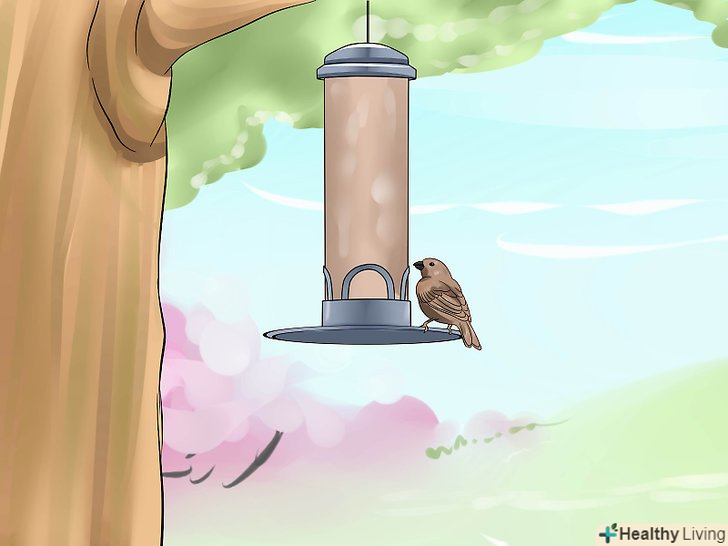 Змініть положення годівниці для птахів. якщо ваша годівниця для птахів буде розташована досить близько до вікна, Птахи, підлітаючи до неї, будуть не в змозі набрати велику швидкість, щоб травмуватися об скло. А якщо годівниця буде досить далеко від вікна, то птахам буде простіше зрозуміти, що воно не є частиною природного навколишнього середовища.- В ідеальному випадку годівницю слід розташовувати або на відстані менше 90 см від вікна, або в більш ніж 9 м від нього. [10]