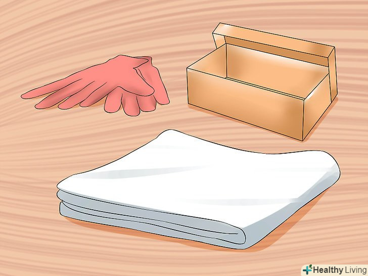 Візьміть паперовий рушник і картонну коробку. якщо ви усунете всі дратівливі фактори, це значно підвищить ймовірність відновлення птиці після потенційно смертельно небезпечного струсу. Для цього вам буде потрібно невелика коробка, що блокує будь-яке світло. Щоб зробити коробку більш комфортною для птиці, вистеліть її паперовим рушником або м'якою бавовняною серветкою. [4]- Якщо постраждала птах досить велика, можна покласти рушник на дно великого паперового пакета, а потім помістити всередину птицю і запечатати отвір пакета степлером, залишивши невелику щілину для вентиляції. Проте, якщо птах настільки велика, що сама потенційно може завдати вам травму, краще утриматися від контакту з нею і негайно викликати на допомогу професіоналів. [5]
