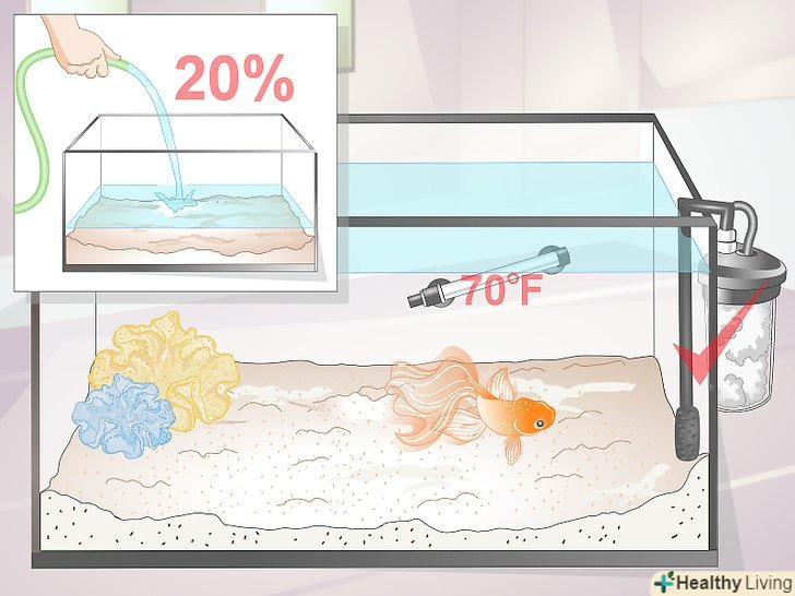 Слідкуйте за тим, щоб вода в акваріумі була чистою і теплою. Температура води в акваріумі повинна знаходитися в межах від 15 до 23 °C. Це особливо важливо, якщо ви хочете, щоб ваша рибка досягла статевої зрілості. [23] погані параметри води — основна причина уповільнення зростання і ранньої загибелі деяких золотих рибок. [24]- Кожні два тижні в акваріумі необхідно виробляти 20-відсоткову підміну води для підтримки чистоти. [25]