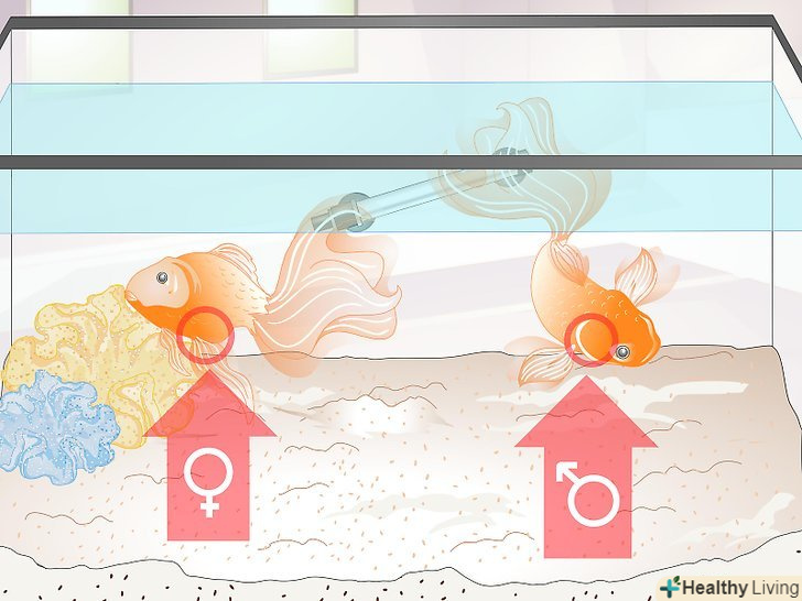 Зверніть увагу на характерну для нересту поведінку. коли настане час нересту, самець почне переслідувати самку по всьому акваріуму. Він буде триматися близько до її яйцекладу, а ви зможете помітити, як він періодично вдаряє її в живіт. [15] якщо після цього ви виявите в акваріумі сотні прозорих круглих ікринок, то ваші риби успішно віднерестилися. А це характерна ознака того, що вони досягли статевої зрілості.- Деякі види золотих рибок, наприклад чорні телескопи і шубункіни, вважають за краще нереститися виключно влітку, тоді як звичайні золоті рибки роблять це в будь-який час року при дотриманні належних умов в акваріумі. [16] [17] [18]