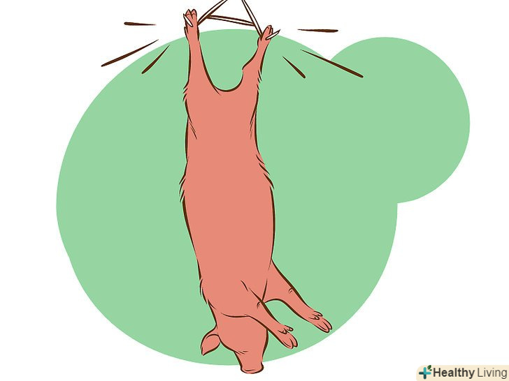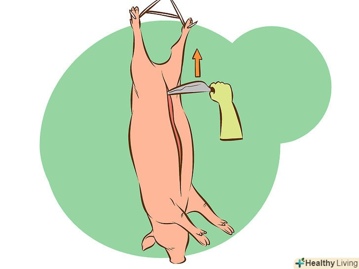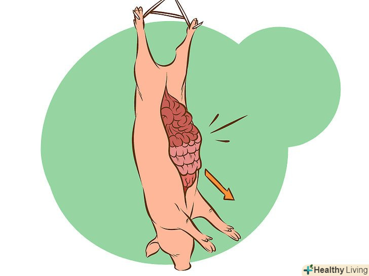 Підвісьте свиню. після забою підвісьте тварину. Для цього треба підготувати фіксатор для разног, що нагадує велику вішалку і використовується для підвішування м'ясної туші. Одягніть ланцюг на фіксатор і прикріпіть до лебідки, за бажанням її можна прикріпити і до задньої частини вантажівки.- Починайте з протягування гачків нижньої частини фіксатора в ноги свині, встромляючи їх досить глибоко, щоб витримати всю тушу. Тепер використовуйте лебідку (або гарненько попотійте), щоб підняти тушу і дати крові стекти. Бажано зробити це якомога швидше після забою. Щоб з туші свині витекла вся кров буде потрібно 15-20 хвилин.