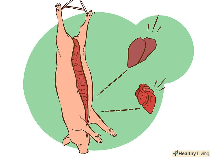 Розділіть ребра спереду, розпилявши їх. після видалення внутрішніх органів з очеревини вам слід прибрати інші нутрощі. Використовуйте ніж для відділення передньої частини ребер, прорізаючи шар хрящів, які з'єднують грудну кістку. Не треба робити це пилкою. Після розрізання грудини видаліть залишилися органи. Серце і печінка зазвичай зберігають і їдять.- Одні вважають за краще почати з розрізання по раніше наміченої лінії і просуватися до хвоста, іншим же зручніше почати з місця біля шлунка і рухатися до голови. Робіть так, як зручніше вам.
