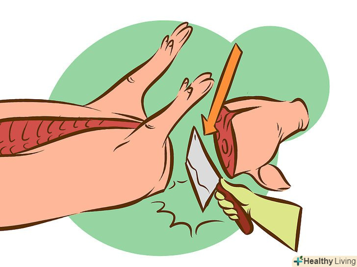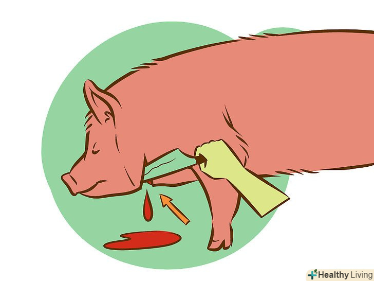 Переріжте свині горло. після того як ви вбили свиню або завалили пострілом, намацайте у неї грудну кістку і встроміть ніж на кілька дюймів вище, роблячи розріз поперек передньої частини горла довжиною в 2-4 дюйма. Потім вставте ніж у цей розріз і проштовхніть на 6 дюймів вгору під кутом 45 градусів до хвоста. Поверніть і витягніть його. Це найшвидший спосіб заколоти свиню. Кров повинна стікати відразу ж. [5]- Деякі люди довго мучаться, шукаючи те саме місце, за допомогою якого можна швидко заколоти тварину. Якщо ви сумніваєтеся в тому, що знайшли його, головне – перерізати яремну вену. Хтось просто ріже глибоко по горлу-під самим підборіддям - і до хребта. На правильне потрапляння вкаже почався злив крові у великих обсягах.