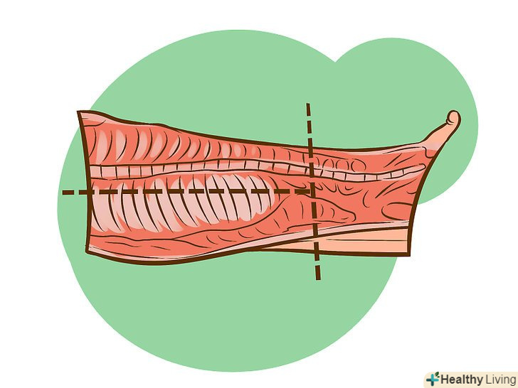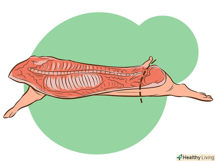 Відокремте окосту. покладіть одну половину порізаною стороною вгору, окіст – це м'ясиста частина стегна. Вирізуйте його гострим обвалочним ножем.- Обріжте м'ясо з живота, слідуючи назад до хребта по контуру окосту і ретельно прорізаючи в найвужчому місці. Поверніть ніж і ріжте прямо вниз, поки не дійдете до верху тазової кістки. Тепер змініть ніж на ножівку (або більш важкий великий обробний ніж) і проріжте кістку, щоб вийшло витягнути окіст. Ви легко знайдете це місце, якщо спочатку правильно зробили розріз уздовж хребта.