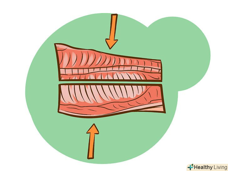Відокремте грудинку. Нижня тонша частина секції містить всіма улюблену свинину: корейка на ребрах. Спочатку краще вирізати грудинку, що знаходиться там, де закінчуються ребра. Вона повинна виявитися досить жирною.- Щоб вирізати її, візьміть ніж і вставте його в підреберну частину, надрізаючи сполучну м'якоть і відсуваючи ребра в сторону. Грудинку зріжте, а хрящ залиште. Ця лінія потім буде Вам орієнтиром. Вийти має легко. Грудинку можна нарізати або залишити цілим шматком для більш зручного зберігання, поки не надумаєте що-небудь зробити з ним.