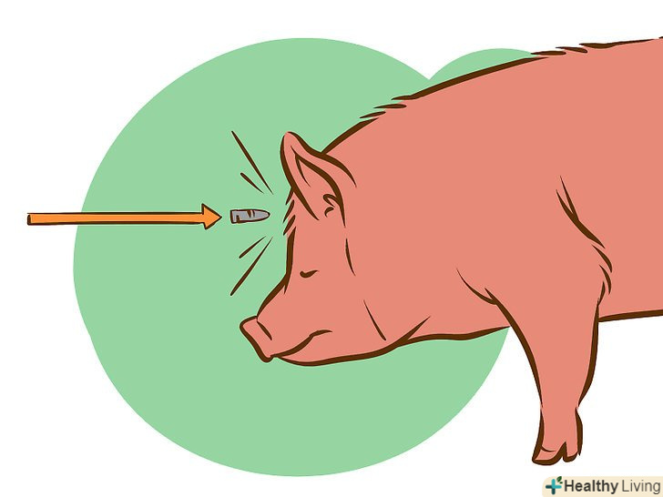 Намагайтеся вбивати свиню гуманно. абсолютно не важливо, вирощена вона на фермі або це дика особина, вам необхідно упевнитися, що процес починається максимально акуратно. Для цього підходить метод швидкого вбивства, що передбачає негайний злив крові. Це в подальшому поліпшить смак м'яса. Питання забою свиней шляхом зливу крові постійно обговорюється.- З моральної точки зору краще використовувати метод забою свині з рушниці хоча б 22 калібру шляхом пострілу в голову, щоб тварина загинула швидко і безболісно. Намалюйте уявну лінію від основи кожного вуха до протилежного ока і прагніть до перетину цих двох точок. Мозок свині вкрай малий, що робить необхідність точного пострілу дуже суттєвою. [3]