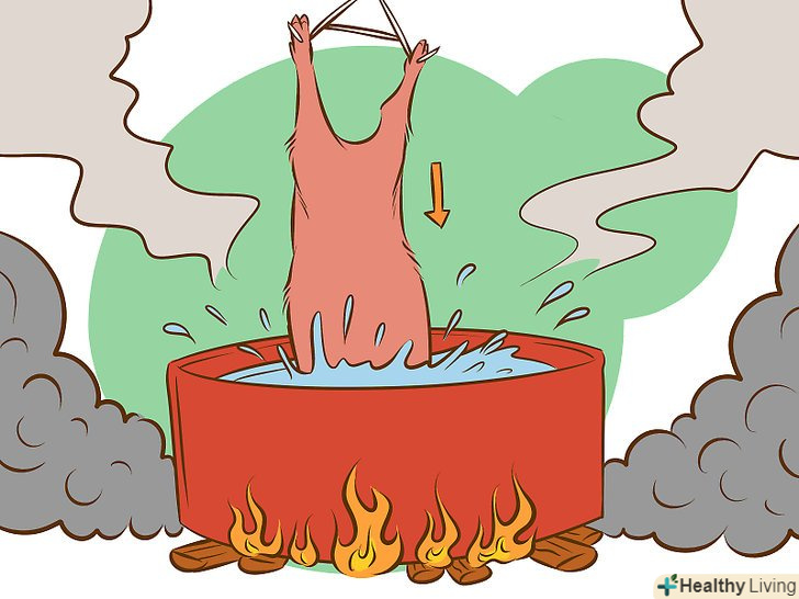 Обшпарте шкуру окропом, якщо вона вам знадобиться. більшість м'ясників швидше збережуть шкуру, що містить смачний бекон, жир і їх залишки. Процес при цьому не сильно ускладниться в порівнянні з простим зняттям шкури. Якщо шкура потрібна, то кращий спосіб видалити волосяний покрив – занурити тушу кілька разів в окріп і проскребти гарненько всю шкуру. [6]- Самий постій і ефективний спосіб нагріти воду – розвести вогонь в ямі і розмістити ємність над нею на вогнетривкій решітці. Не обов'язково доводити воду до кипіння, але температура повинна досягати 150 градусів за Фаренгейтом. Переконайтеся в безпеці процесу. Акуратно опустіть тушу, що висить на фіксаторі, в гарячу воду на 15-20 секунд, а потім витягніть.