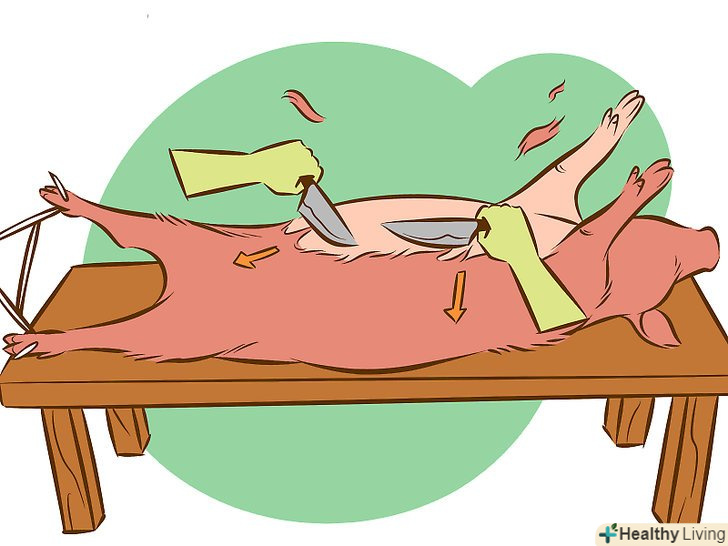 Зніміть шкуру зі свині, якщо не хочете возитися з видаленням щетини. якщо немає досить великої ємності для занурення і випалювання цілої туші, або ви просто не бажаєте докладати до цього зусилля, то цілком прийнятний варіант зі зняттям шкури і її подальшим викиданням. Переходьте до наступного етапу видалення нутрощів. Необхідно акуратно пройти ножем по всій туше, щоб зняти шкуру.- Для її видалення вам треба здійснювати рухи гострим ножем від себе, як би підковирюючи шкуру. Не поспішайте і намагайтеся зберегти жировий прошарок по максимуму. Процес може зайняти близько 1,5 годин.