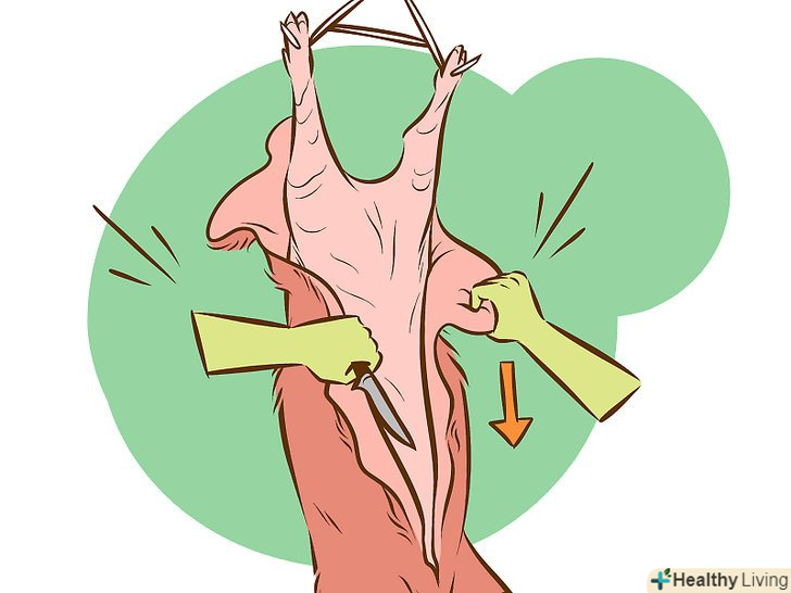 Ріжте від грудини до паху. затисніть шкіру біля основи грудини, де закінчуються ребра і починається живіт, і потягніть якомога сильніше на себе. Вставте ніж і акуратно ріжте вниз до центру черева між двома рядами сосків. Працюйте ножем акуратно, щоб не розрізати слизові шлунка і кишечника. Розріжте тушу до паху.- В якийсь момент сила тяжіння спрацює на вашу користь, і нутрощі виваляться без ваших зусиль. Непогано мати поруч відро при розрізанні черева, щоб скласти туди всі органи. Вони досить важкі, тому необхідно діставати їх акуратно.