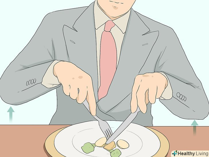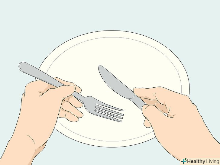 Навчіться правильно тримати столові прилади. Тримайте вилку і ніж так, ніби у вас в руках олівець, а не стискайте їх в кулаці. Якщо вам потрібно що-небудь розрізати, тримайте ніж у правій руці, а вилку-в лівій. Як тільки розріжете їжу, можна або залишити вилку в лівій руці, або опустити ніж і перемістити вилку в праву руку. [11]- Обов'язково використовуйте відповідні столові прилади для різних страв. Якщо на столі лежить кілька ножів і виделок, спочатку використовуйте крайні, поступово просуваючись до тарілки.
