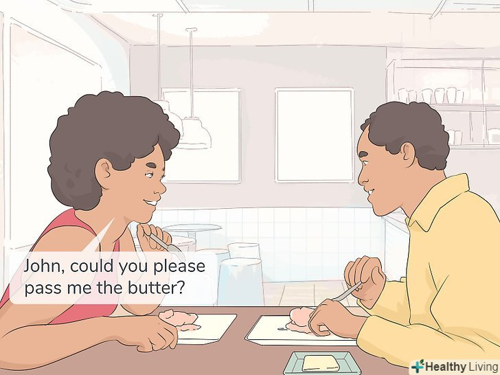 Попросіть іншу людину за столом передати вам що-небудь. не тягніть руку через весь стіл — ви можете перешкодити іншим, до того ж така поведінка вважається грубим тоном. Зверніться до людини, яка знаходиться найближче до потрібного вам предмету на столі, і попросіть передати його вам. Після обов'язково подякуйте людини, щоб проявити люб'язність. [13]- Наприклад, можна сказати: «Юлія, не могли б ви передати мені масло, будь ласка?»