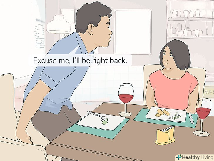 Прикривайте рот, якщо вам потрібно витягнути застрягла в зубах їжу. якщо у вас щось застрягло між зубами, прикрийте рот серветкою або рукою, щоб приховати його від огляду оточуючих. Постарайтеся непомітно витягти застрягла їжу, щоб не привертати до себе уваги. Як тільки ви витягнете їжу, що застрягла між зубами, покладіть її на край тарілки або загорніть в серветку. [15]- Якщо вам не вдасться витягти застряглу між зубами їжу за кілька секунд, Принесіть вибачення і вийдіть з-за столу, щоб відлучитися в туалет.
