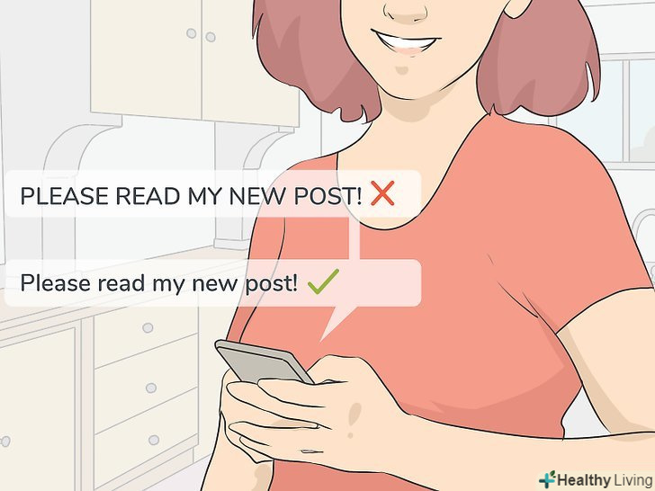 Оформляйте пости малими, а не великими літерами. використання великих літер має на увазі нестямний крик. При написанні поста використовуйте великі літери тільки в тому випадку, коли починаєте пропозицію, пишете ім'я власне або скорочуєте фразу. Таким чином, ваші публікації будуть читатися звичайним тоном. [20]- Наприклад, варіант: "будь ласка, прочитайте мій новий ПОСТ!"- читається набагато агресивніше, ніж: "будь ласка, прочитайте мій новий пост!»
