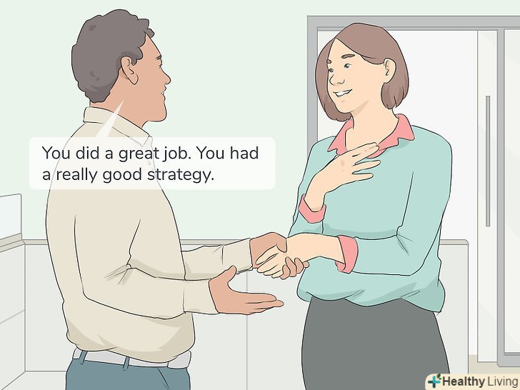 Вітайте людей з їхніми досягненнями, щоб підтримати їх. це покаже, що ви з повагою до них ставитеся і вмієте визнавати чужі успіхи. Якщо один з ваших друзів щось виграє або отримає підвищення, скажіть: "вітаю!"- або: "Здорово!"Так ви продемонструєте, що він вам небайдужий. [7]- Не приписуйте чужий успіх у свої заслуги. Наприклад, якщо людина виграє у вас партію в шахи, не кажіть: «це тільки тому, що я зробив кілька поганих ходів». Краще скажіть: "Ти виконав відмінну роботу. У тебе була дуже хороша стратегія".