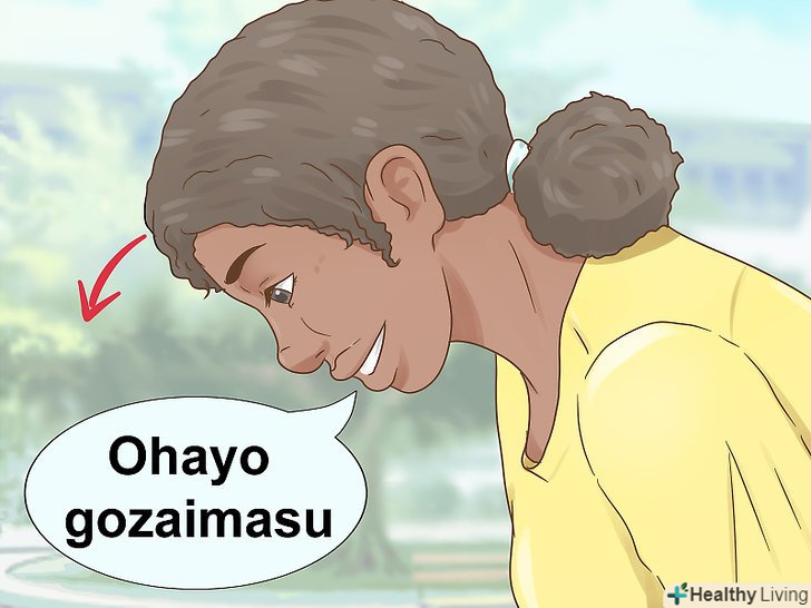 З ранку поклоніться і скажіть "Ohayo gozaimasu". Фраза перекладається як "Доброго ранку". Це відмінний спосіб офіційно привітатися з ким-небудь з ранку. Ви можете говорити її кому завгодно, починаючи з людини, що працює на рецепції готелю і закінчуючи друзями і знайомими. [10]