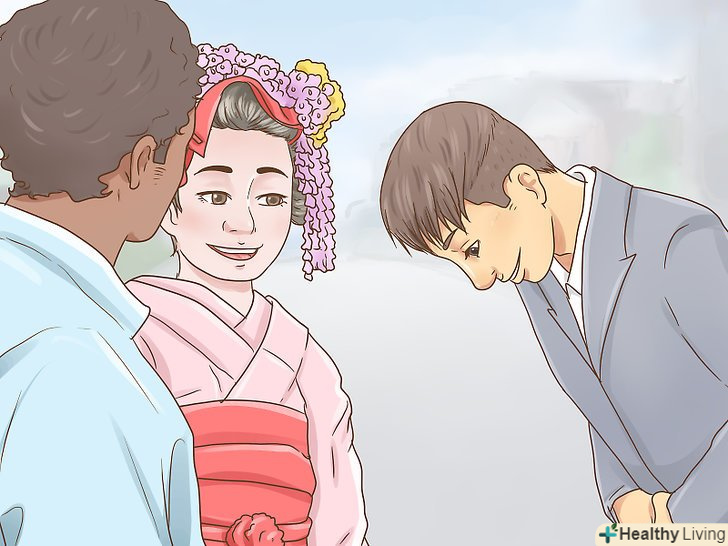 Зберігайте дистанцію. обійдіть без рукостискань, обіймів або навіть дружніх поплескувань по спині. Замість цього зберігайте шанобливе відстань в кілька кроків. У японській культурі цінують простір і відокремленість, так що переконайтеся, що ваша мова тіла відображає ці принципи.- Зберігайте дистанцію в два або три кроки між вами і іншою людиною — це корисне, універсальне правило. Більша відстань може викликати незручності і труднощі при розмові та інших взаємодіях.