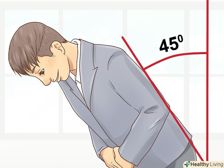 Поклоніться під кутом 45 градусів від талії. не випрямляйтеся 2-5 секунд, а руки тримайте на рівні стегон. Чим більше поваги ви хочете продемонструвати, тим нижче потрібно вклонитися. [3]- Ви також можете поклонитися, притиснувши руки до грудей (на рівні серця).