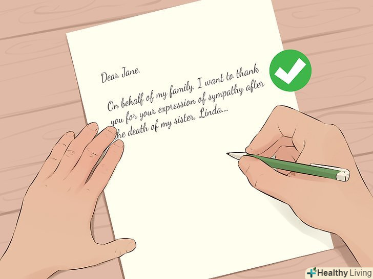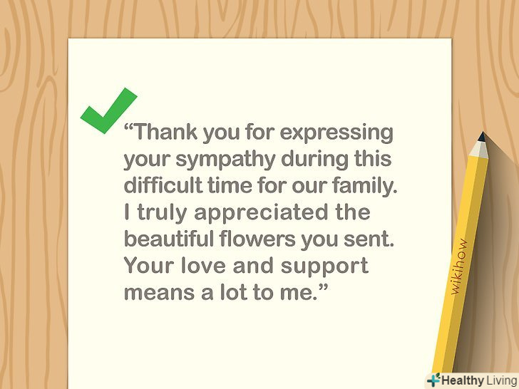 Напишіть коротку щиру відповідь тим, хто надіслав вам повідомлення або надав допомогу. Якщо ви відповідаєте на онлайн-повідомлення або листівку з співчуттями, необов'язково писати багато тексту. Подякуйте людині за співчуття або підтримку. Можна згадати конкретну деталь, наприклад, вінок, який він надіслав, або його присутність на панахиді. [2]- Наприклад: "спасибі, що висловили свої співчуття в цей важкий для нашої сім'ї час, і що надіслали такий прекрасний вінок. Ваша любов і підтримка дуже багато значить для нас".