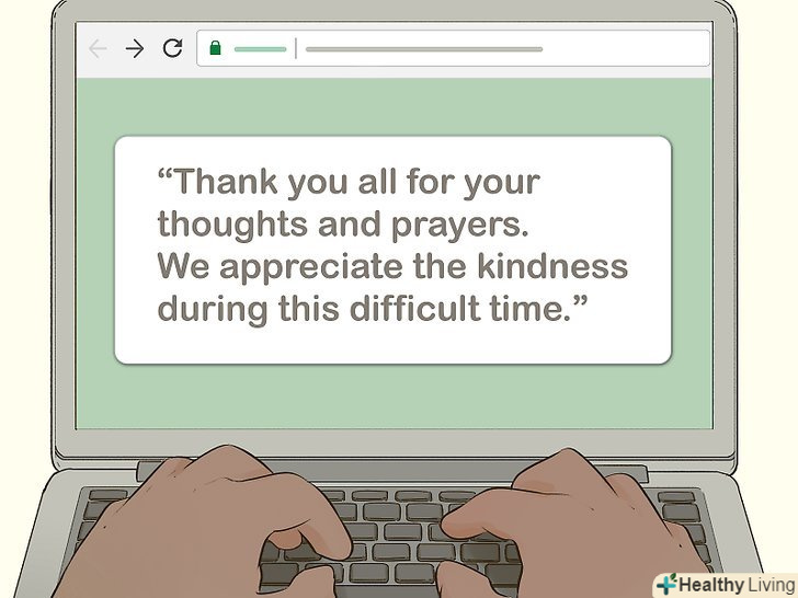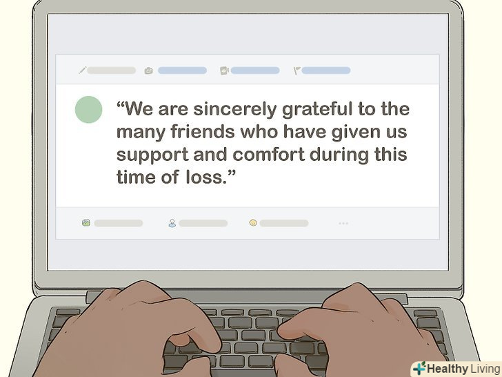 Світ не стоїть на місці. і на місце некрологам в газетах приходить онлайн-некролог. Ці некрологи публікуються в Інтернеті і є новим способом повідомлення про смерть людини. Якщо ви розміщували онлайн-некролог на одному зі спеціалізованих сайтів, опублікуйте слова подяки тим, хто відгукнувся. [8]- Наприклад: "Спасибі всім за вашу увагу і молитви. Ми цінуємо Вашу доброту в цей важкий час"»