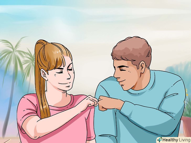 Відмовтеся від обіймів і привітайте людину іншими способами. так ви покажете, що ваші відносини дружні і невимушені. Наприклад, можна помахати рукою, вдарити кулаком об кулак або долонею об долоню в якості привітання. Завдяки цьому між вами встановляться невимушені платонічні відносини. Наприклад, можна використовувати дружній жест типу «дай п'ять» або легкий грайливий удар по плечу, перш ніж переходити до обіймів. [5]- Якщо молода людина посміхається, дивиться вам в очі і відчуває себе невимушено, можете обійняти його, коли будете прощатися з ним.