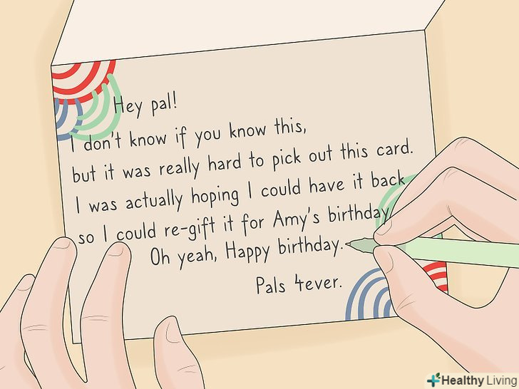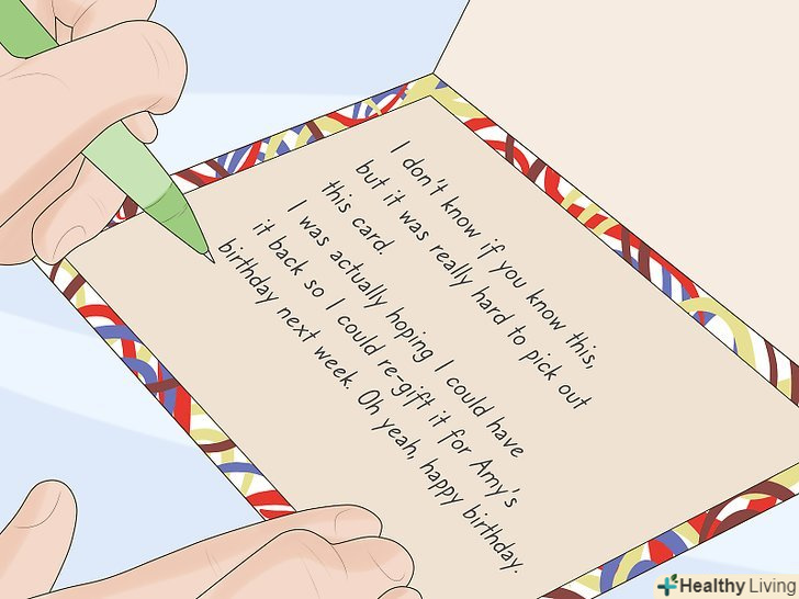 - Напишіть щось веселе в листівці (наприклад: "мені було не так просто вибрати цю листівку. Я сподіваюся, ти мені її повернеш, і я зможу подарувати її на день народження Емі, яке пройде наступного тижня. Ах так, З Днем Народження. ")