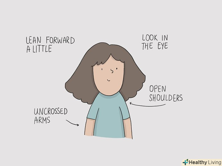Приймайте відкриту, вітальну позу. дружнє спілкування-це не тільки слова. Мова вашого тіла теж повинен бути доброзичливим: нахиліться трохи вперед до співрозмовника, розправте плечі, не схрещуйте руки і дивіться одному прямо в очі. Це дасть йому зрозуміти, що ви відкриті і сприйнятливі до розмови. [5]- Не нахиляйтеся вперед настільки, щоб вторгатися в особистий простір людини. Суть в тому, щоб нахилитися вперед лише трохи, щоб показати свій інтерес, а не настільки сильно, щоб змусити друга відчувати себе некомфортно.