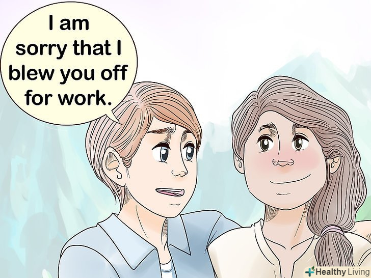 Почніть зВибачень за свої проступки. Скажіть конкретно, за що ви просите вибачення. Крім того, не кажіть: «мені шкода, що ти так себе почуваєш». Визнайте свої помилки, використовуйте щирі слова і не жартуйте над ситуацією. [12]- Наприклад, можна сказати: «я шкодую, що я часто віддавав пріоритет роботі і поставив свої амбіції вище твоїх потреб. Ти заслуговуєш більшої поваги, а я все приймав як належне».