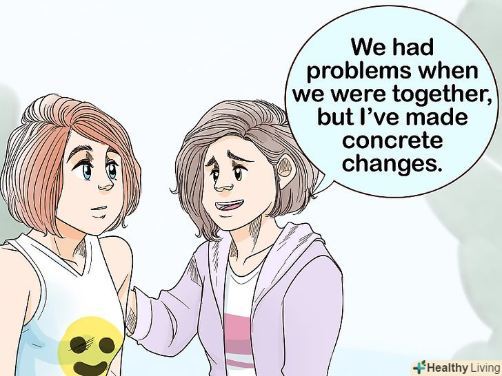 Продемонструйте реальні зміни і не давайте порожніх обіцянок. крім визнання помилок, важливо показати рух у правильному напрямку. Покажіть реальні зміни і готовність продовжувати змінюватися в кращу сторону. [14]- Якщо дівчина перебуває у відносинах, то скажіть: «у наших відносинах були проблеми, але я зважився на великі зміни. Я поважаю твої рішення і зрозумію, якщо ти щаслива з Михайлом. Проте я впевнений, що ми підходимо один одному, тому сподіваюся, що ти подумаєш над тим, щоб спробувати відновити наші відносини і цього разу ми зробимо все правильно».