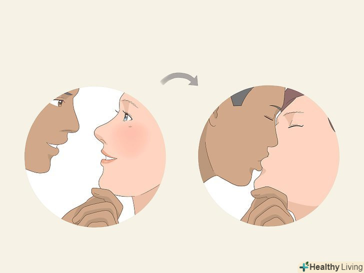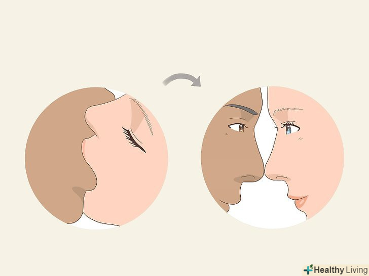 Трохи нахиліть голову в ту чи іншу сторону. більшість правшів природним чином прагнуть нахилити голову вправо, а лівші – вліво. Важливо те, що ви і ваш партнер повинні нахиляти голову в одному напрямку (наприклад, обидва вліво або обидва вправо), створюючи дзеркальний ефект і дозволяючи вам зустрітися губами.- Непомітно міняйте положення голови. Ви можете зробити процес ще цікавішим, змінюючи рухи з боку в бік кожні кілька поцілунків. Зміна положення повинна відбуватися в кінці одного і початку другого поцілунку.