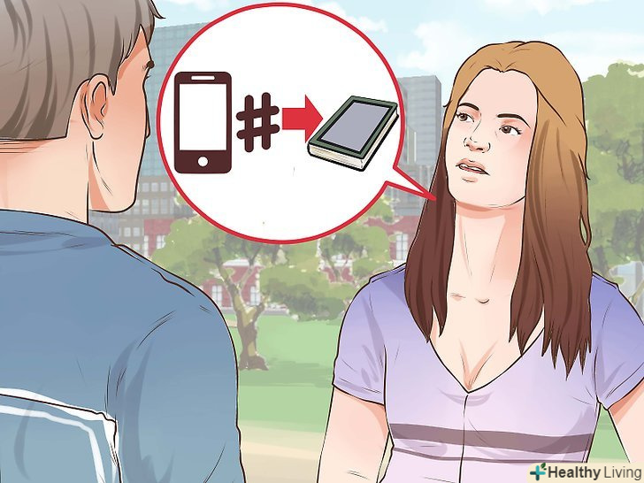 Дайте хлопцеві свій номер телефону. Запропонуйте симпатичному хлопцеві свій номер телефону. Це один з найнадійніших способів, який може спонукати людину дати свій номер. Або ж він запропонує вам пізніше передзвонити або написати. [5] існує кілька варіантів передачі іншій людині свого номера телефону: