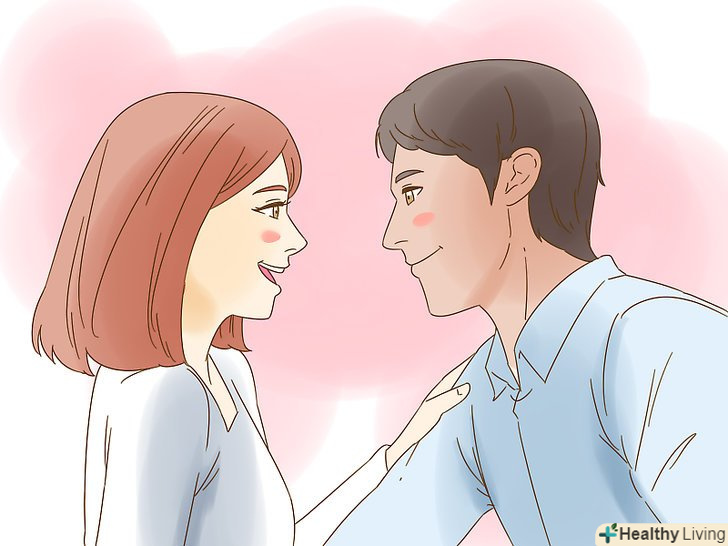 Фліртуйте з ним ненароком. Вам слід показати молодій людині, що ви не хочете обмежуватися лише дружніми відносинами. Тому фліртуйте з ним, щоб він не сприймав вас лише як подругу. Не варто фліртувати так, щоб молода людина почала відчувати незручність. Своїми жестами і мімікою покажіть йому, що ви не хочете залишатися лише друзями. [26]- Дивіться молодій людині в очі, щоб показати, що ви відкриті для ближчого спілкування. Якщо ви раніше не робили цього, такий жест може показати ваш романтичний інтерес. Дивіться йому в очі, коли ви спілкуєтеся, або робіть це, коли він знаходиться в іншій частині класу. Якщо ви будете сміятися, коли він буде розповідати щось смішне, або посміхнетеся, коли він подивиться на вас, ваші відносини перейдуть на новий рівень. Робіть це ненароком. В іншому випадку ваш пильний погляд може змусити людину відчувати незручність. [27]