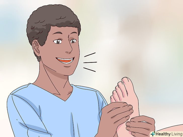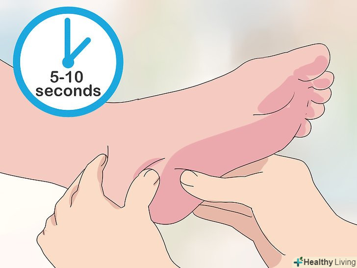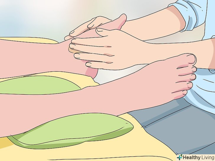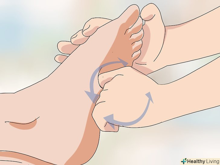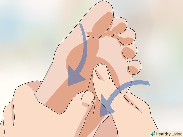 Розітріть верхню частину стопи великими пальцями рук. почніть з кінчика великого пальця ноги і повільно рухайтеся до щиколотки. Потім поверніться назад по тій же стопі, обхопивши її долонями і твердо натискаючи пальцями. [6]- Пройдіться вгору і вниз по стопі два або три рази.