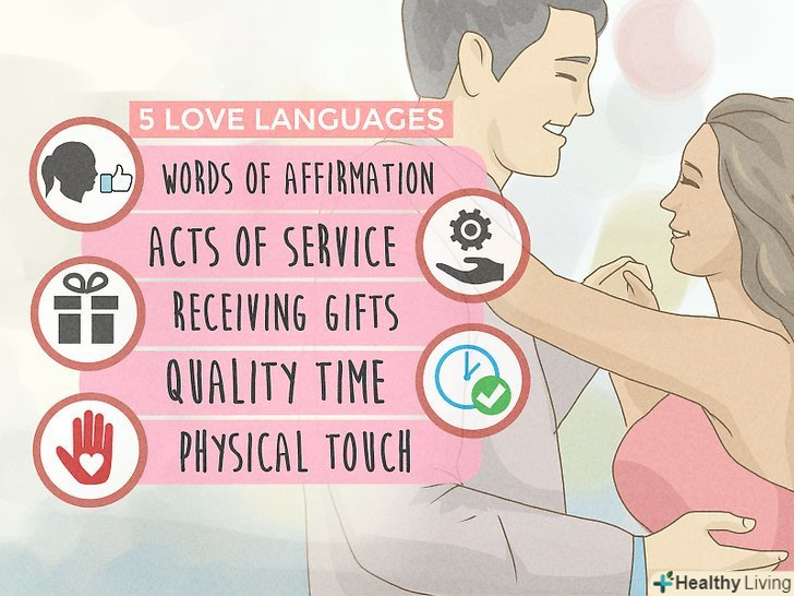 Розмовляйте на його мові. в останні двадцять з хвостиком років багато експертів і прості люди прийняли ідею дослідника відносин Гарі Чепмена, згідно з якою кожна людина "розмовляє" на одному або декількох з п'яти "мов любові". Визначте мову любові свого хлопця, щоб ефективно спілкуватися і висловлювати свої почуття. [7]- П'ять "мов любові" Чепмена включають позитивні оцінки, спільний час, подарунки, різні люб'язності та фізичний контакт. Залежно від своєї основної мови любові людина може краще сприймати прояви любові, які відповідають такій категорії. Наприклад, якщо людина вважає за краще "спільний час", тоді спільний відпочинок на вихідних він оцінить вище, ніж подарунковий сертифікат зі свого улюбленого магазину.