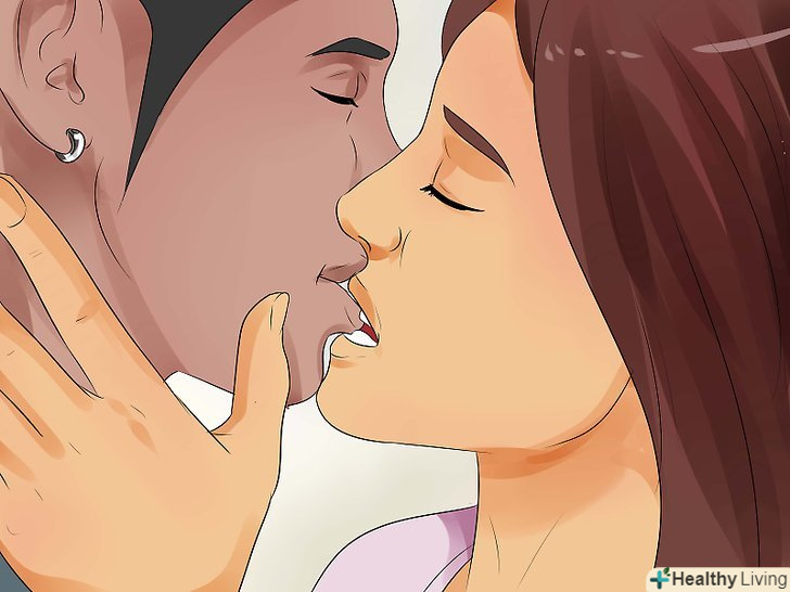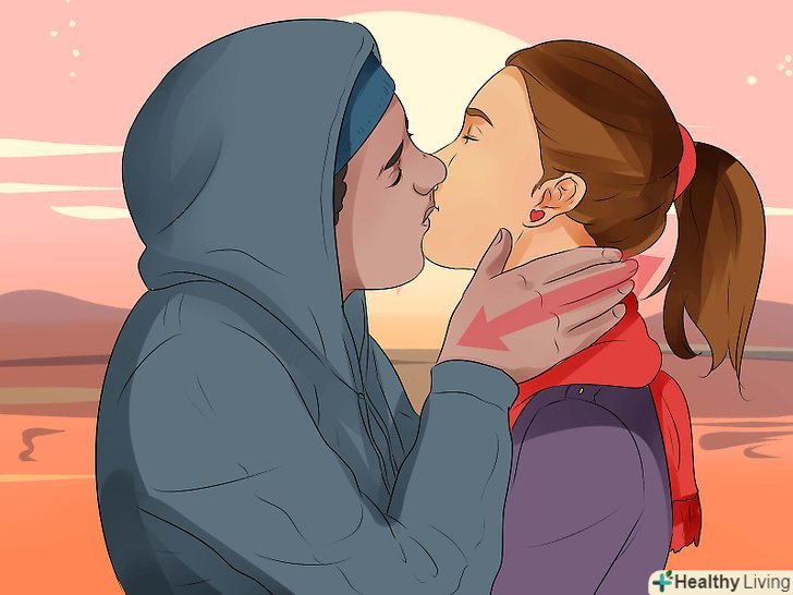 Поцілуйте партнера в шию або під підборіддям. поцілунок в шию-класичний поцілунок, у якого є багато переваг. Людям приємний цей поцілунок, до того ж, іноді хочеться зробити перерву між поцілунками в губи, тому що вони занадто близькі. Спробуйте ніжно вкусити або трохи посмоктати шкіру шиї, але не перестарайтеся, ви ж не хочете залишити на шиї у партнера непривабливий слід! Насправді, в цьому поцілунку навіть не потрібно використовувати мову, інакше поцілунок стане мокрим і слинявим. [7]