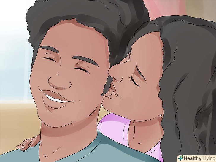 Поцілуйте свого партнера в мочку вуха або в щоку. легке томне дихання партнеру на вушко допоможе зробити поцілунок ще більш пристрасним. Не лякайтеся-м'яке дихання стане справжнім фокусом. Щоб посилити ефект від поцілунку і дихання, можна ніжно прошепотіти на вушко партнеру його ім'я, але вам потрібно шепотіти тихо і спокійно, тому що звуки, що лунають безпосередньо біля вушної раковини, сприймаються сильніше і голосніше. Потім, якщо хочете, можна ніжно поцілувати партнера в щоку. [6]