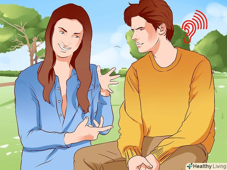 Прислухайтеся до слів свого партнера. обговорюючи питання сексу, невинності і очікувань від відносин, уважно слухайте свого партнера. Вам слід чітко розуміти, чого партнер хоче і чого він чекає від відносин. Намагайтеся слухати людину активно.- Якщо ви будете активно слухати, ви будете краще розуміти один одного. Не відволікайтеся ні на що під час розмови. Кивайте і використовуйте інші жести, щоб продемонструвати свій інтерес. Зосередьтеся на словах свого партнера, а не намагайтеся сформулювати свою власну відповідь. [4]