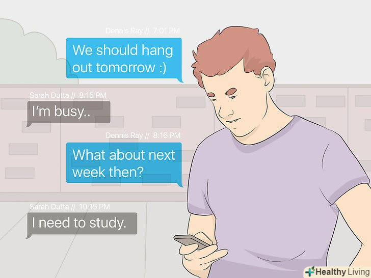 Повірте їй на слово. навіть якщо дівчина сама заплуталася в своїх почуттях до вас або не хоче виходити за рамки грайливих листувань, ні — значить ні. Якщо вона каже, що ви їй не подобаєтеся, хоча і здається, що вона посилала вам змішані сигнали, вам потрібно просто повірити їй на слово і рухатися далі. [19]- Якщо ви поставите їй пряме запитання, а вона взагалі не відповість, можете прийняти це як знак того, що вона в вас не зацікавлена. Ігнорувати не дуже люб'язно, але люди нерідко так чинять, якщо відчувають себе некомфортно, ніяково або винувато за те, що відкидають когось.