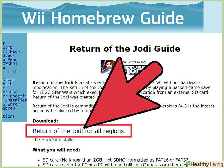 Скачайте відповідний хак для версії вашої Wii. для версій системи 4.2 і нижче, скачайте правильний хак для програми»Bannerbomb". Якщо версія вашої системи 4.3, вам знадобиться відповідна Ліцензійна гра і хак. У цій статті ми використовуємо гру " LEGO Зоряні війни: повна Сага». Вам знадобиться диск з грою і сейв гри»Повернення Джедая".