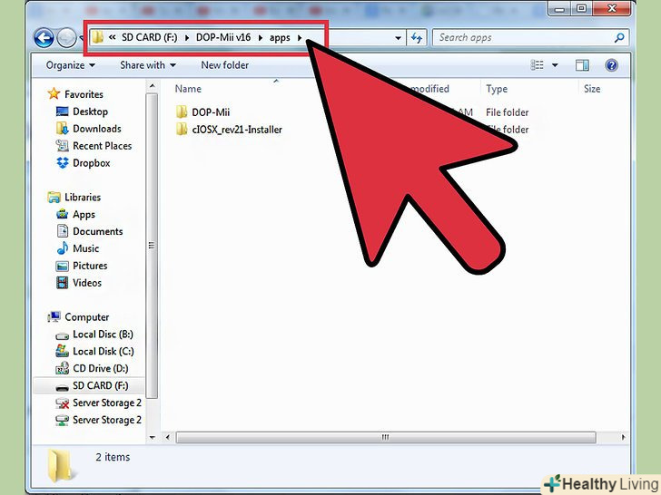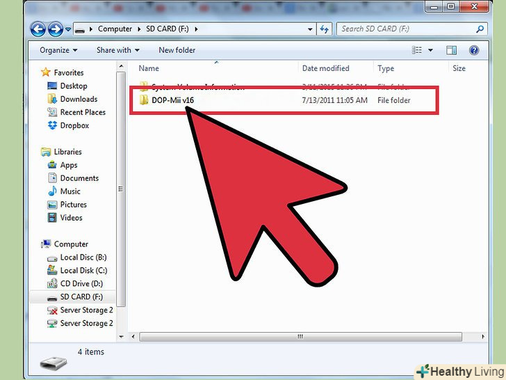 Витягніть програму "DOP-Mii" на SD-карту. збережіть файлову структуру недоторканою. Вставте SD-карту в приставку і відрийте канал «Homebrew». Запустіть "DOP-Mii «зі списку програм і виберіть»Встановити IOS36 (v3351) w/ FakeSign".- Виберіть "Так", Коли вас попросять застосувати дозволи NAND і скачайте патчі з інтернету. Знову виберіть "Так", коли побачите повідомлення про відновлення. У підсумку ви опинитеся на каналі «Homebrew». Витягніть» SD " карту і вставте її в комп'ютер.