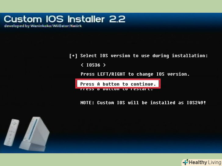 Витягніть інсталятор "cIOS «у папку»Програми". збережіть файлову структуру недоторканою. Вставте SD-карту назад в приставку і перейдіть на канал «Homebrew». Відкрийте інсталятор "cIOS". З варіантів версій Програми виберіть "IOS36".